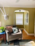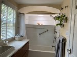 We expanded the footprint of the room into existing closets, and creating a plant shelf above the stairs. The result is a much larger, luxurious room that feel light and airy, and spa-like, while still feeling in place in the vintage cottage. The modern marble hex floor tile is an over-the-top focal point. And along with the original archway above the shower, allows the room to feel classic yet modern.