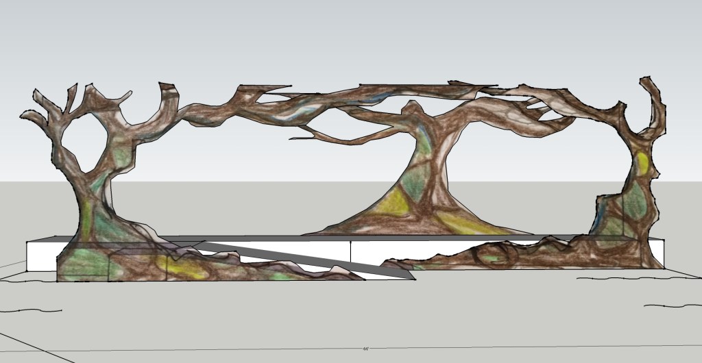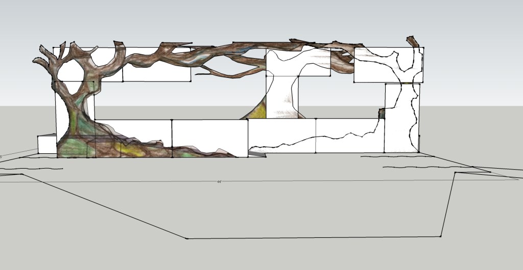 Every designer needs to do Into the Woods, right? The thing I love the most about this production is how closely the finished set resembled the sketches. It’s truly gratifying to see your vision come to life like this. The trees were made with plywood, and scraps of styrofoam with stretched canvas.